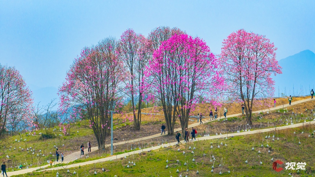 4月5日,游客在四川绵阳北川羌族自治县陈家坝镇的龙子梁山上踏春观赏辛夷花,享受惬意假期。(C视觉 张波 摄)