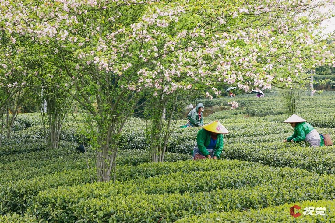 4月5日,雅安市名山区红星镇骑龙村,万亩茶山绘春色,茶农忙着采摘新茶。(C视觉 杨兰 摄)