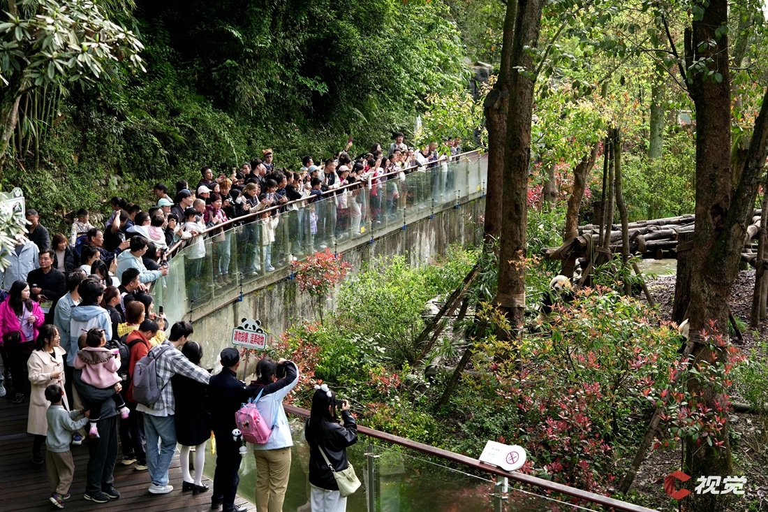 4月6日,位于都江堰市的熊猫谷迎来众多游客近距离观看可爱的熊猫。(C视觉 袁义明 摄)