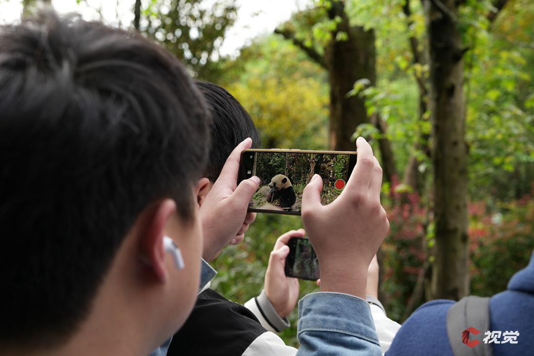 4月6日,位于都江堰市的熊猫谷迎来众多游客。图为游客拍摄可爱的大熊猫。(C视觉 袁义明 摄)