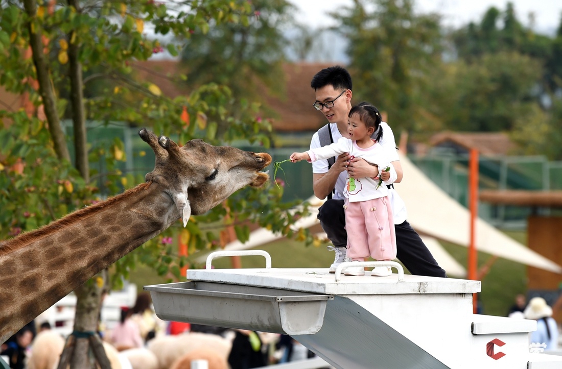 4月4日,位于宜宾市南溪区仙源街道的欢乐田园游人如织。图为一位家长带着孩子喂食长颈鹿。(C视觉 王宇 摄)