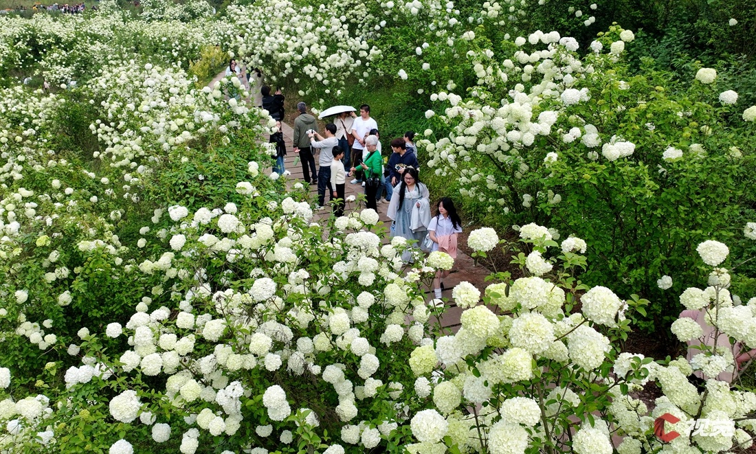 4月4日,泸州市纳溪区丰乐镇马村苗木基地里,成片的中华木绣球次第开放,吸引许多游客前来踏青赏花。(C视觉 廖胜春 摄)