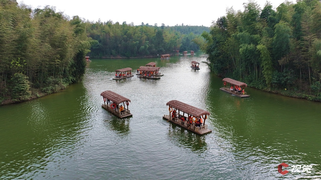 4月4日,宜宾市长宁县蜀南竹海景区内,游客们乘坐竹筏,泛舟竹海,乐享假期。(C视觉 张宝林 摄)