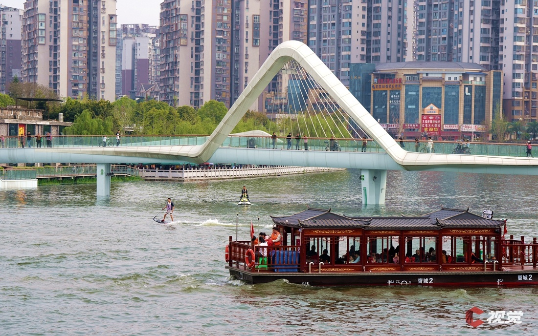 4月5日,广安市賨城里开通水上游玩项目,游客们乘坐游船、水上摩托艇,畅游西溪河。(C视觉 范聪 摄)
