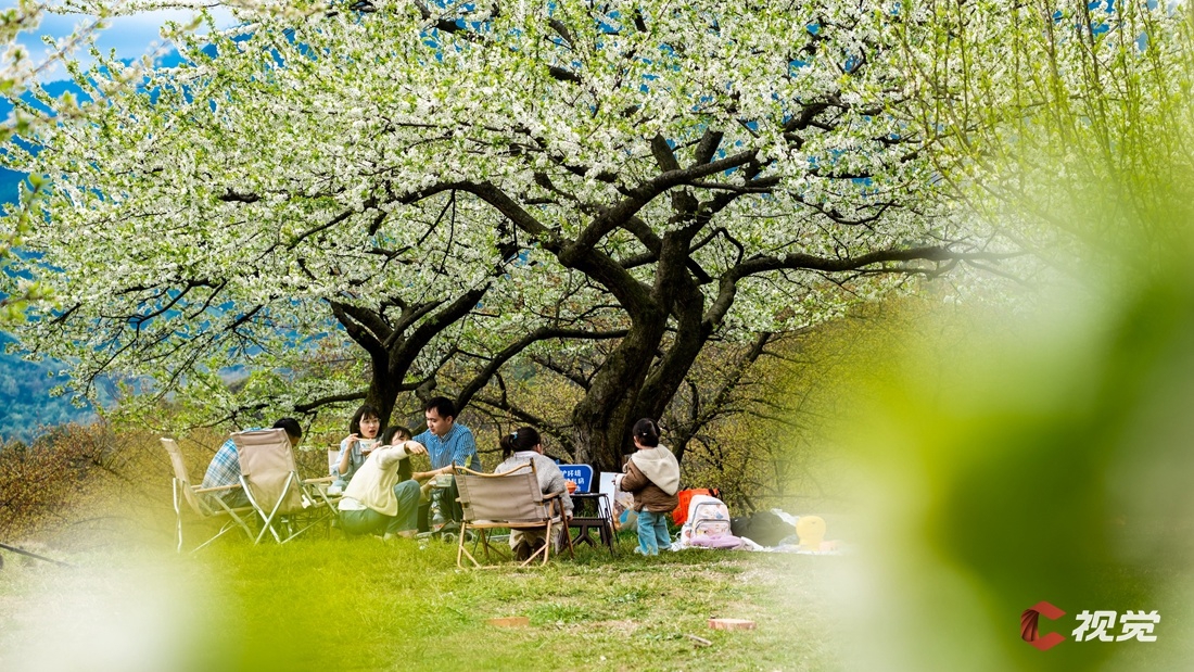4月6日,成都市大邑县大坪山李花烂漫,不少市民前来踏青露营,为假期画上圆满句号。(C视觉 李旭 摄)