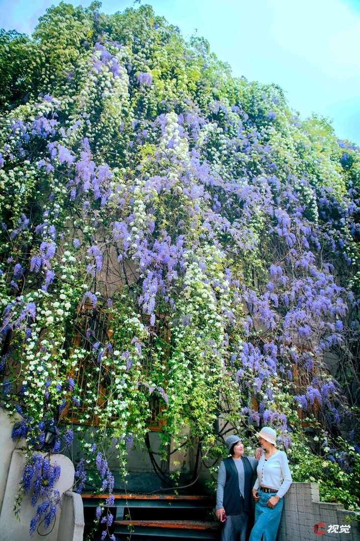 成都的春天不仅在公园田野,也在街头市井。4月5日,成都大庆路上的一家茶社,开满紫藤和七里香的“瀑布”吸引不少市民打卡。(C视觉 周巧旻 摄)