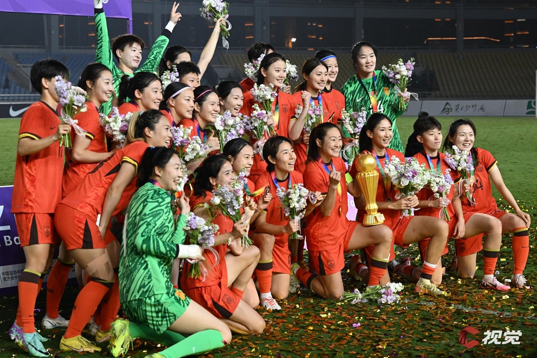 中国女足夺冠后合影。