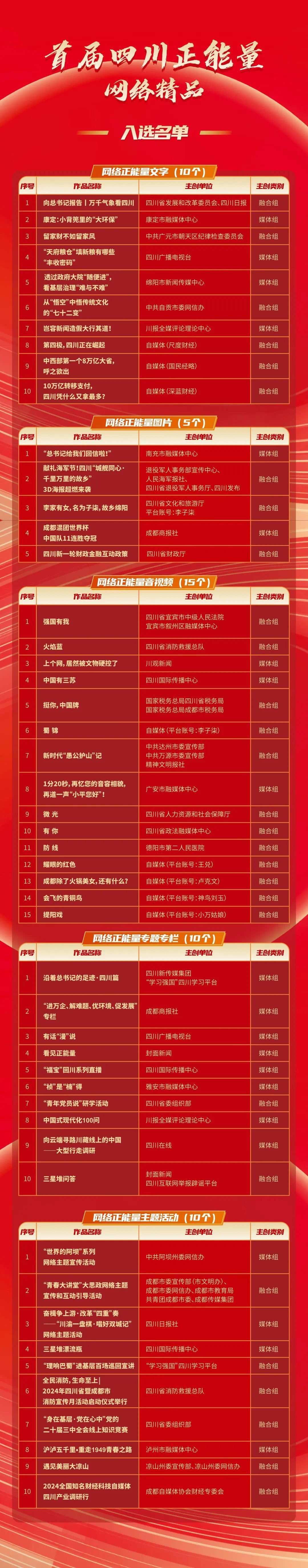 首届四川正能量网络精品颁奖活动,对标中央网信办“中国正能量网络精品征集展播活动”,整体遵循“导向正确、流量优先,注重实效、兼顾结构”原则开展评选,采取线下推荐与线上征集相结合方式,按照“网民认可、社会认同、有影响力”的标准,设置文字、图片、音视频、专题专栏、主题活动五大类别,分为媒体组和融合组,国际传播作品占比大于10%,是对近年来特别是年度创作能力的集中检阅和生动呈现。