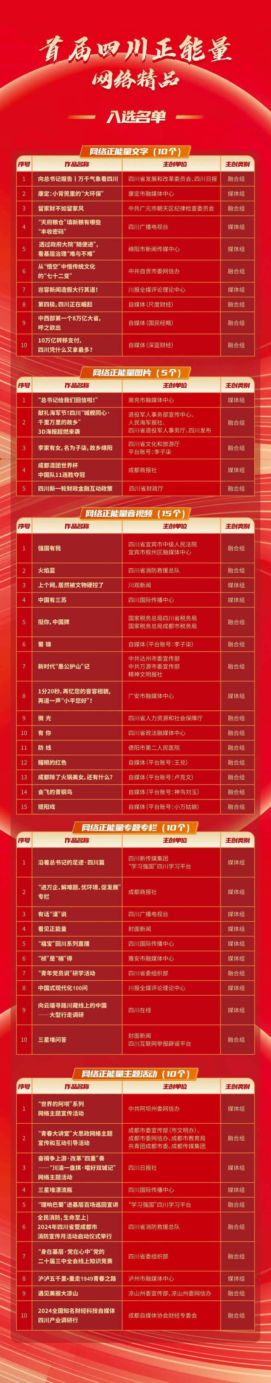 本次评选活动从征集作品中评选出四川正能量网络精品50件,四川十佳“正能量澎湃大流量”网络传播精品10件。四川发布作品《心跳中国》、川观新闻作品《这样的中国你AI了吗》、四川观察作品《今年我十岁》等10件作品获评四川十佳“正能量澎湃大流量”网络传播精品。