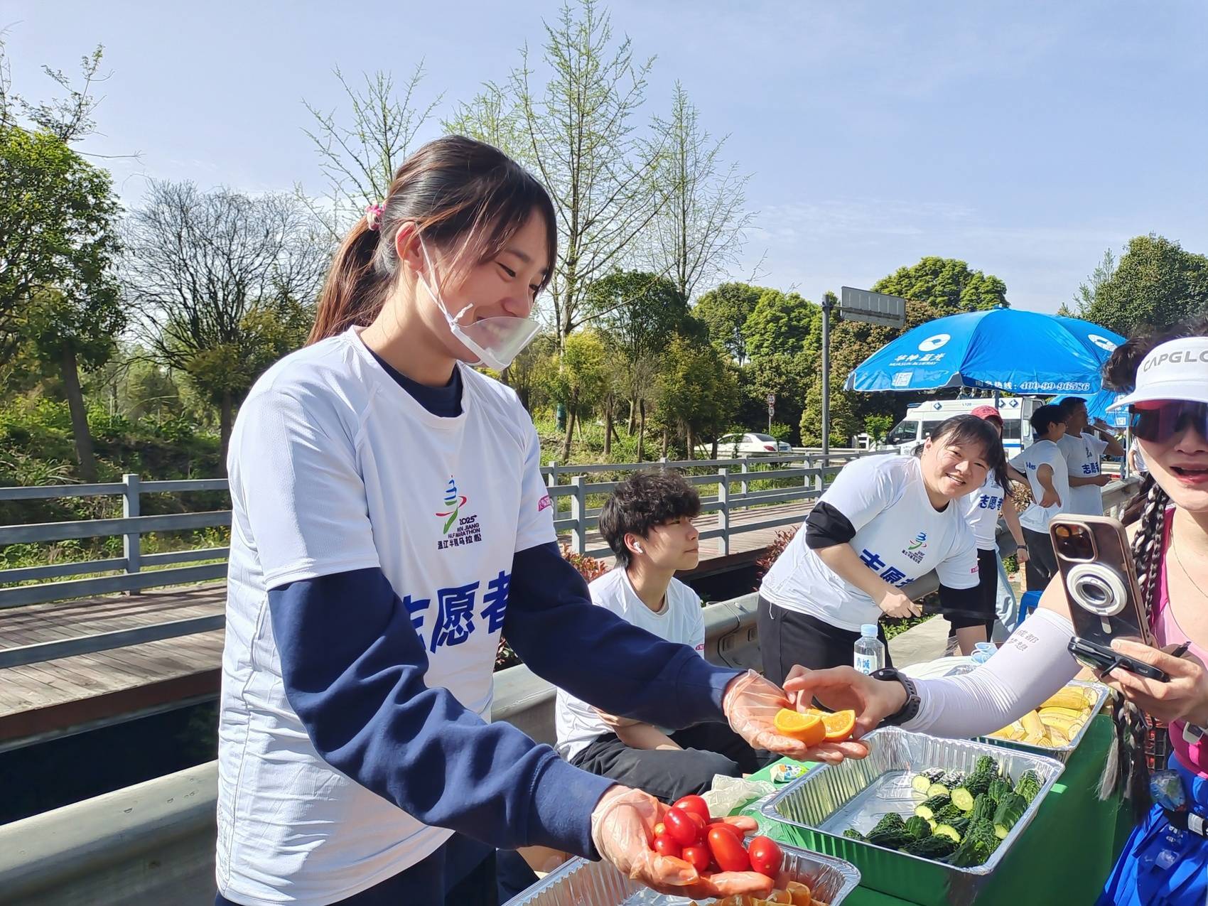 比赛现场志愿者们为参赛选手发放补给。文增勇摄。