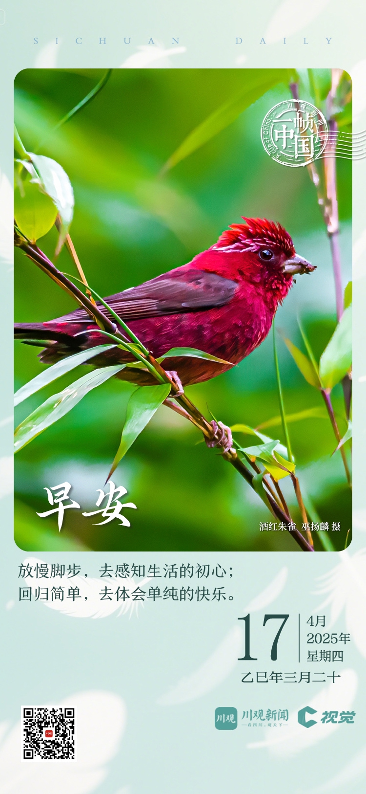 说到“朱雀”,我们可能会联想到中国古代神话中的神鸟,而今天的《一帧中国》,川观新闻带你认识现实中的一种朱雀——酒红朱雀。