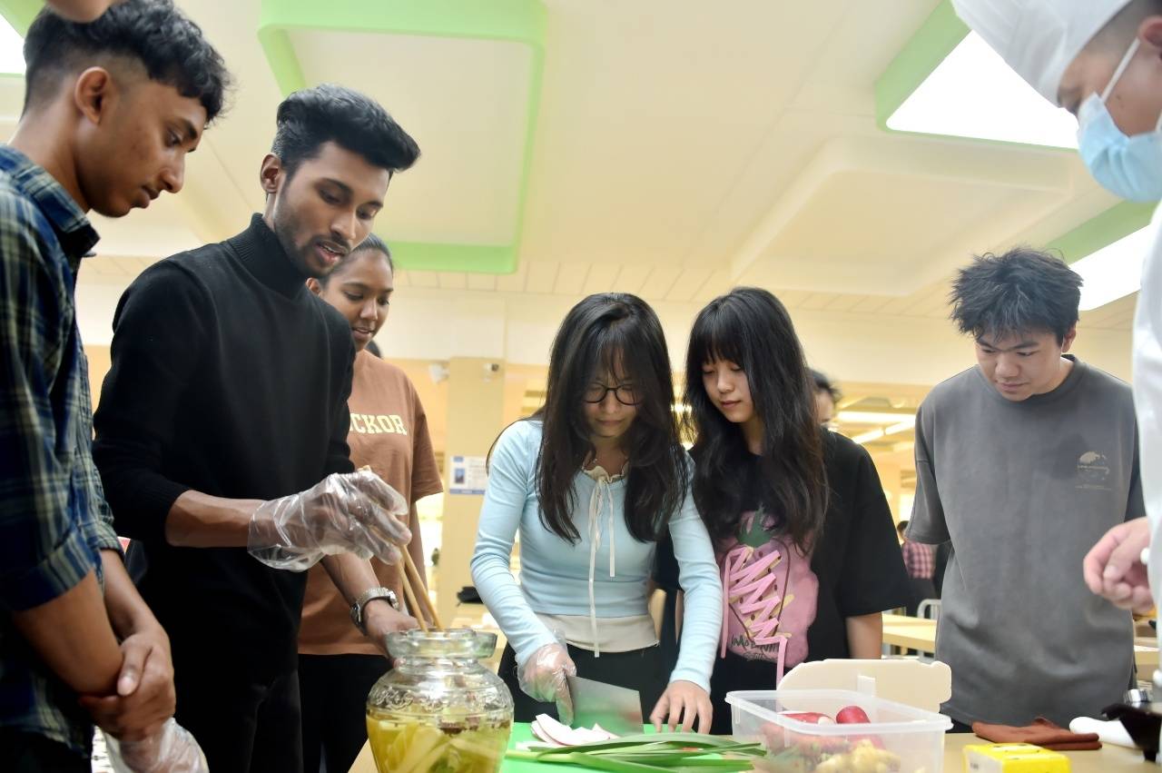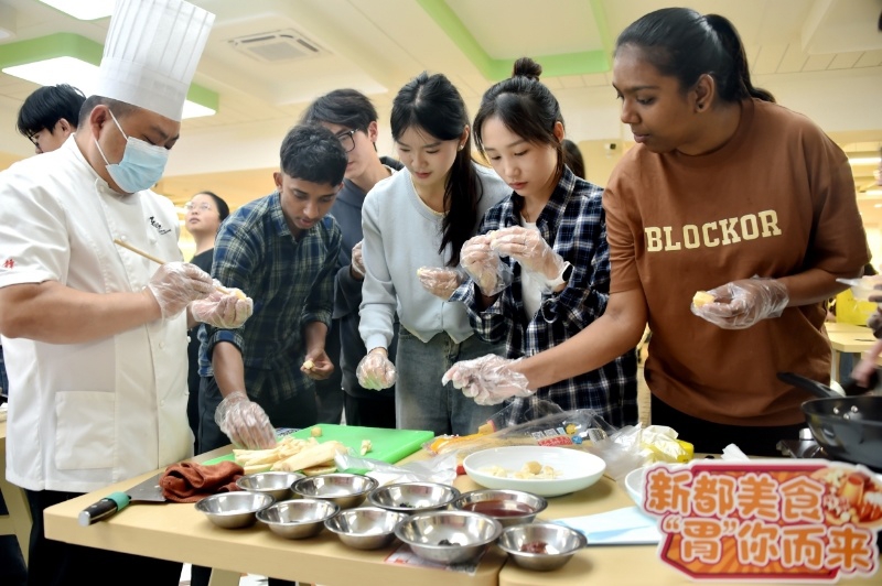 日前,成都新都非遗美食进校园活动在西南石油大学学生食堂举行。中外学生在川菜名厨指导下,一起制作、品尝新都非遗美食,体验当地传统饮食文化。