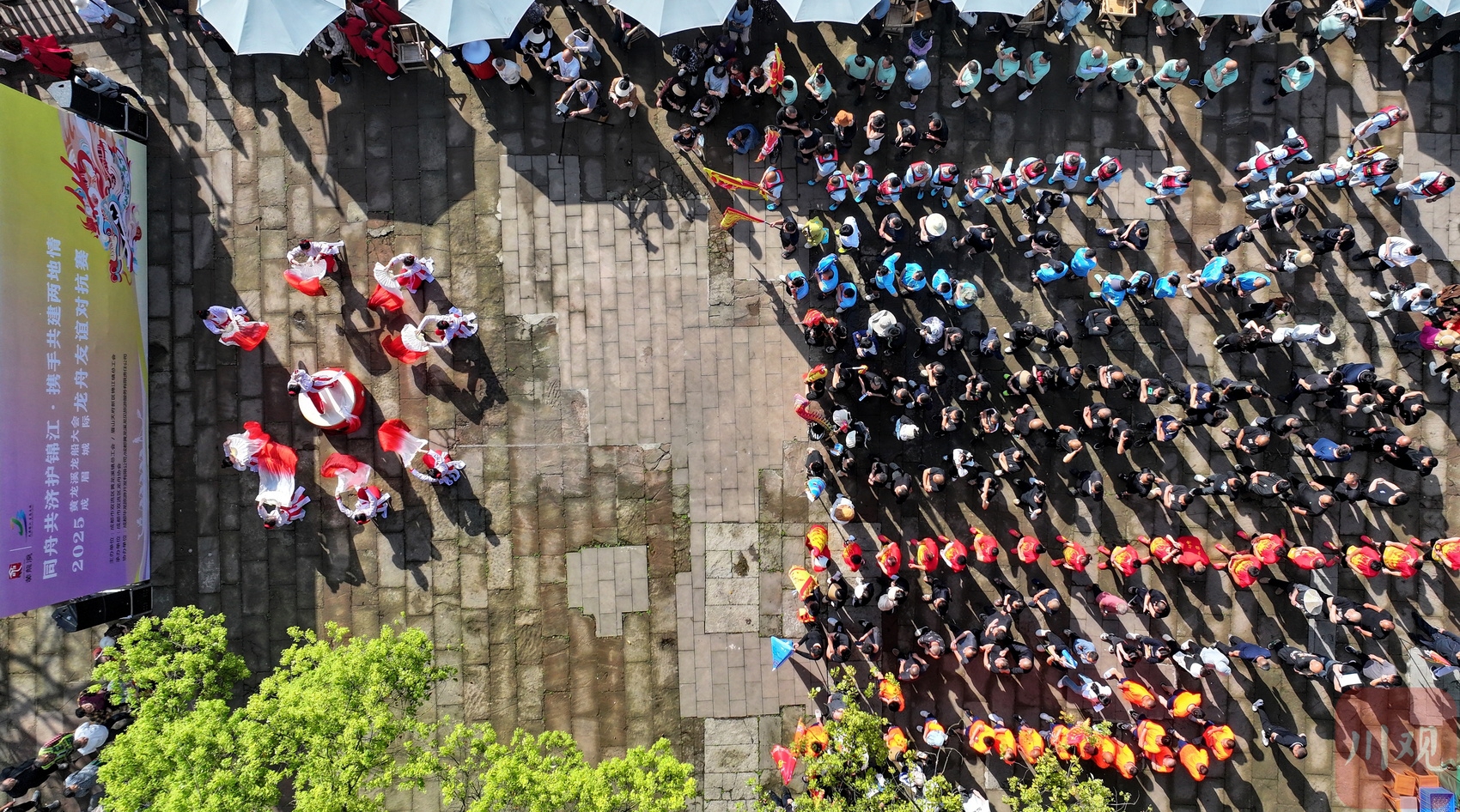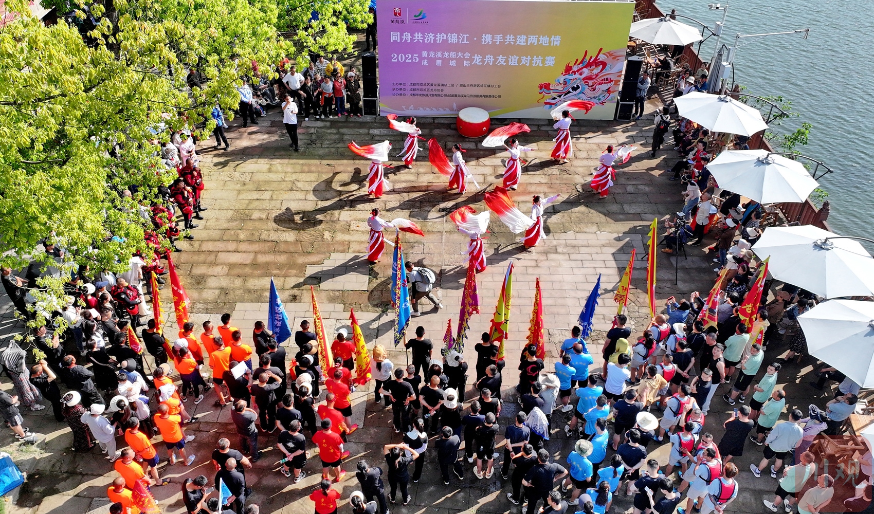“2025年黄龙溪龙船大会成眉城际龙舟友谊对抗赛”开赛前的非遗表演吸引观众。