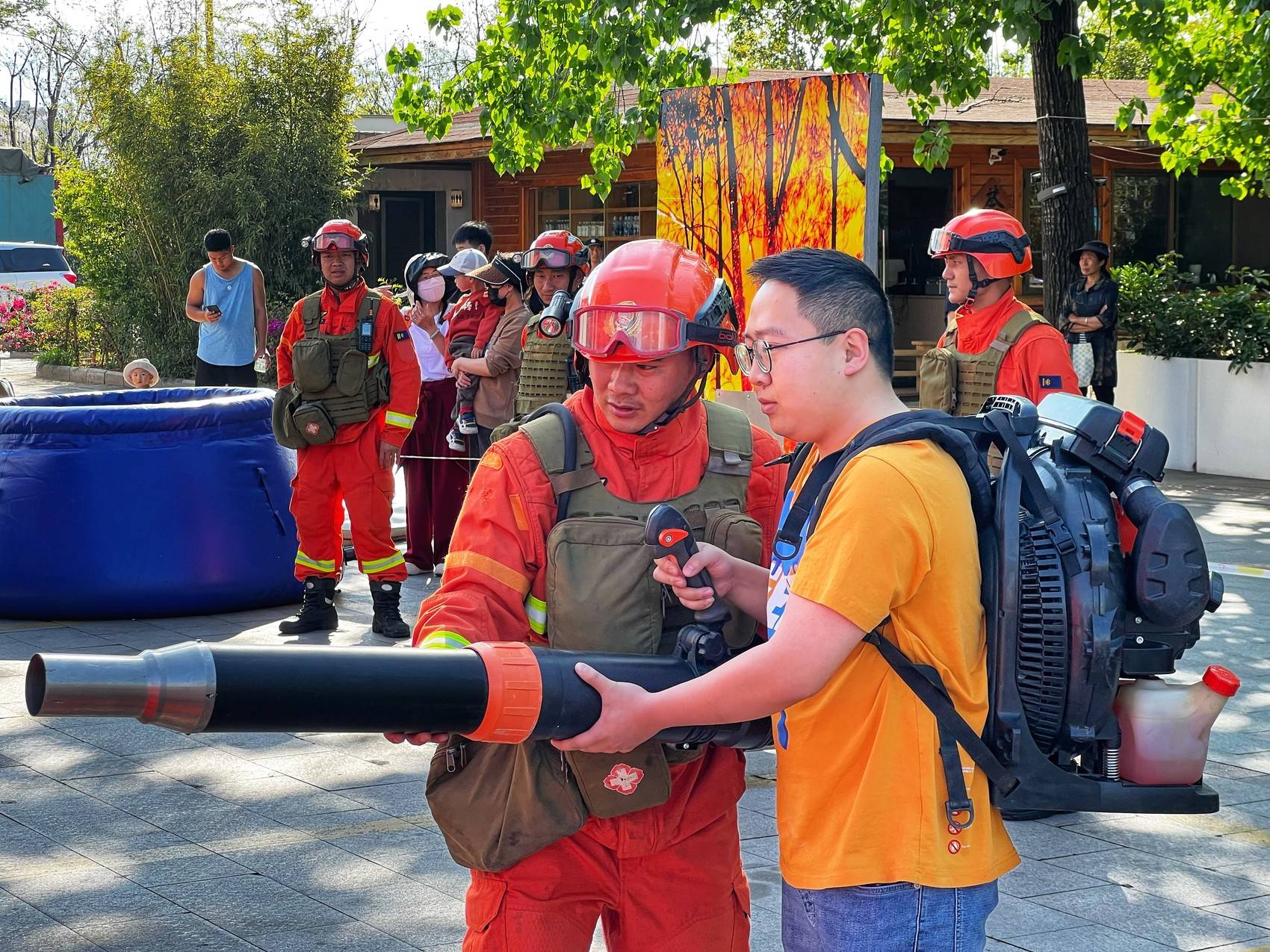 凉山主会场现场,各类防灭火装备一字排开:大型无人机、消防机器狗、高压水枪……许多市民也参与其中,在现场工作人员指导下体验各类消防装备。