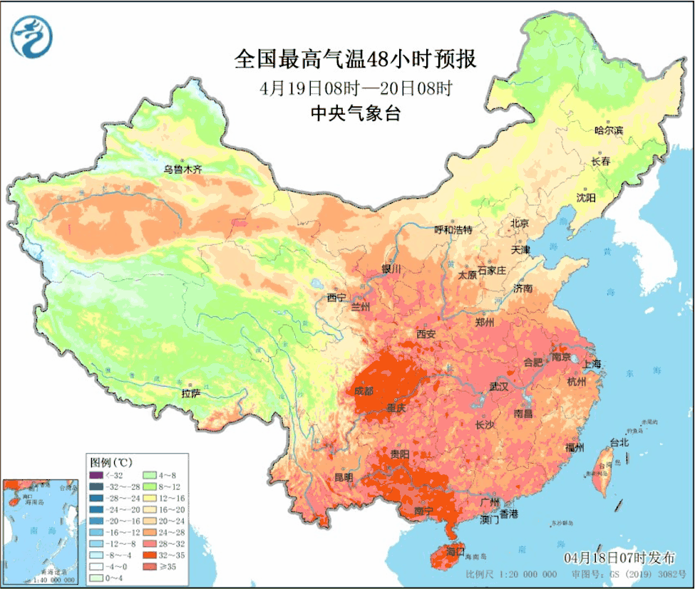 要晓得,前一日(4月17日)的同一时刻,盆地乃至整个四川的最高气温不足33℃,超过32℃的仅两个城市。