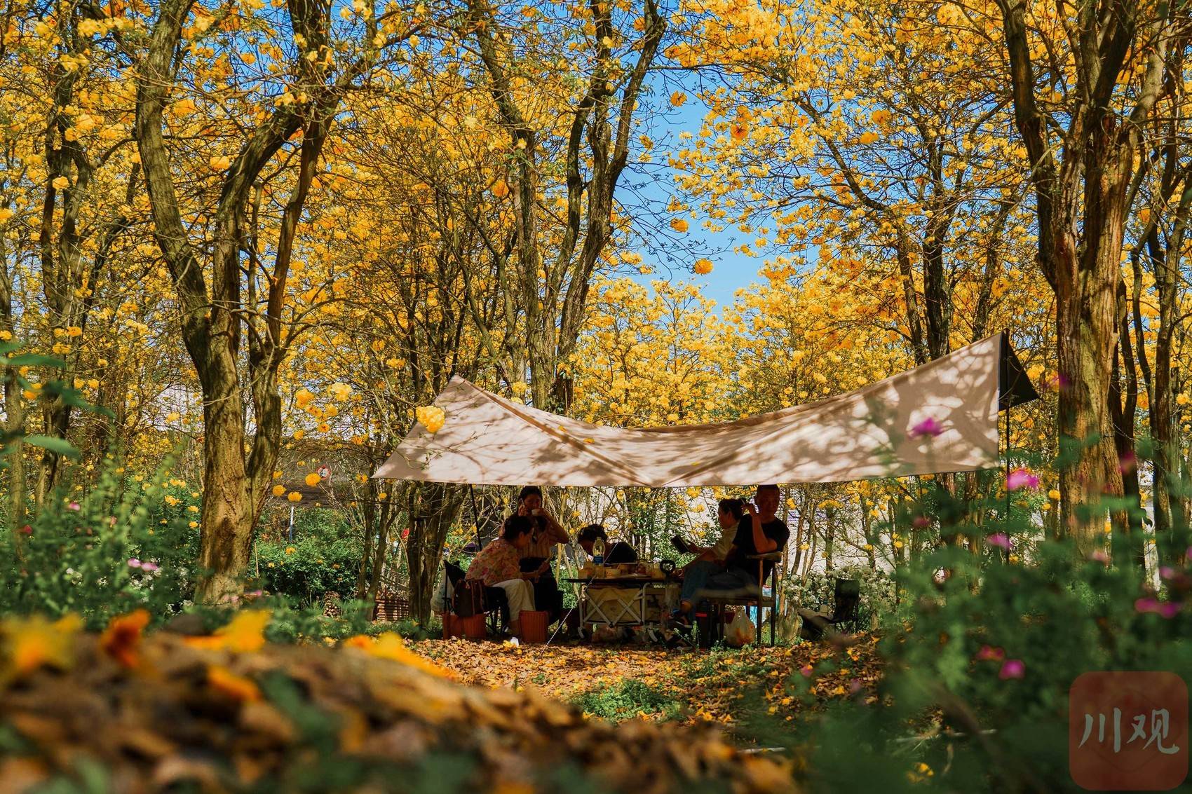 4月17日,在成都市温江蓝枫园,成片黄花风铃木在阳光下熠熠生辉,是市民在金色花海中露营。C视觉 李佳 摄