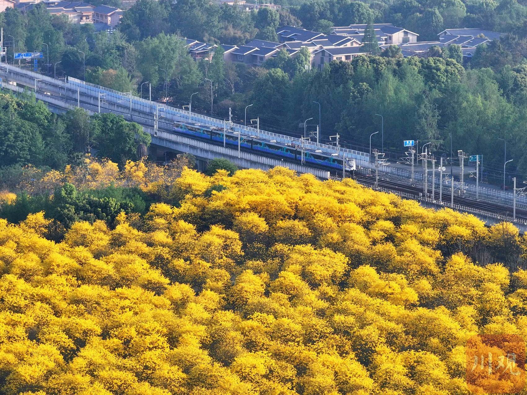4月17日,成都市地铁19号线金星站沿线,被大片金黄的黄花风铃木簇拥,构成一幅醉人的春日地铁图景。C视觉 朱志宏 摄