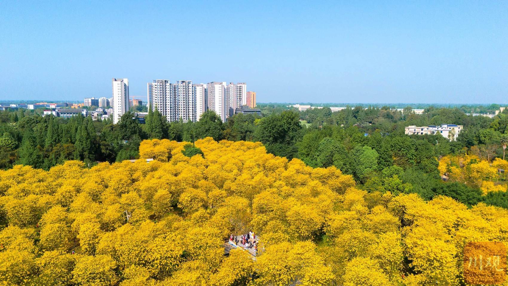 4月17日,在成都市温江蓝枫园里,成片的黄花风铃木在阳光下熠熠生辉,游客们穿梭其间,或驻足拍照,或漫步赏花,宛若画中景致。C视觉 李佳 摄