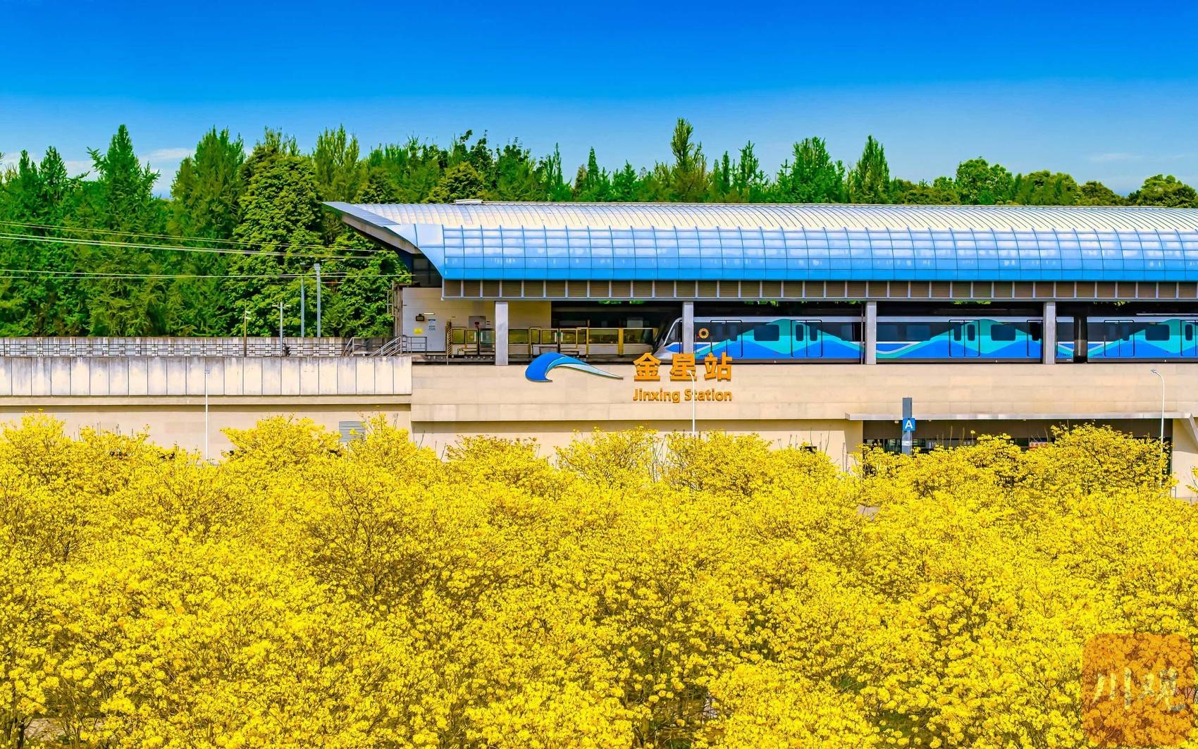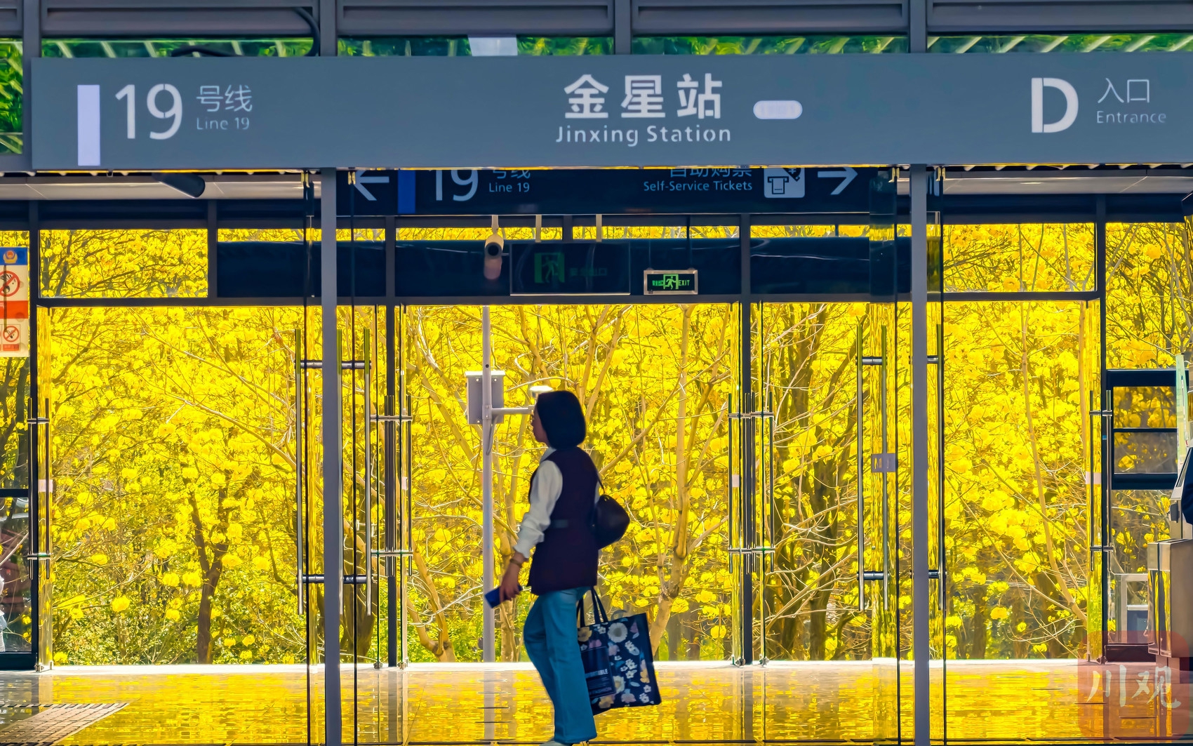 4月15日,成都市地铁19号线金星站,被大片金黄的黄花风铃木簇拥,构成一幅醉人的春日地铁图景。C视觉 张志强 摄