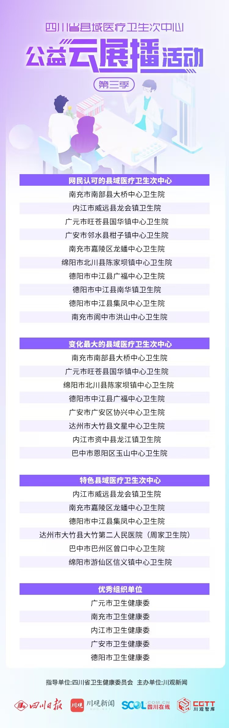 3月17日至3月31日,省卫生健康委、川观新闻联合开展第三季“四川省县域医疗卫生次中心公益云展播活动”,四川第三批86个次中心集体亮相。该活动旨在让网友们在基层就医更便利,让群众了解身边的基层医疗卫生服务的新面貌、新变化,宣传四川省乡村卫生体系建设的亮点做法和成效。