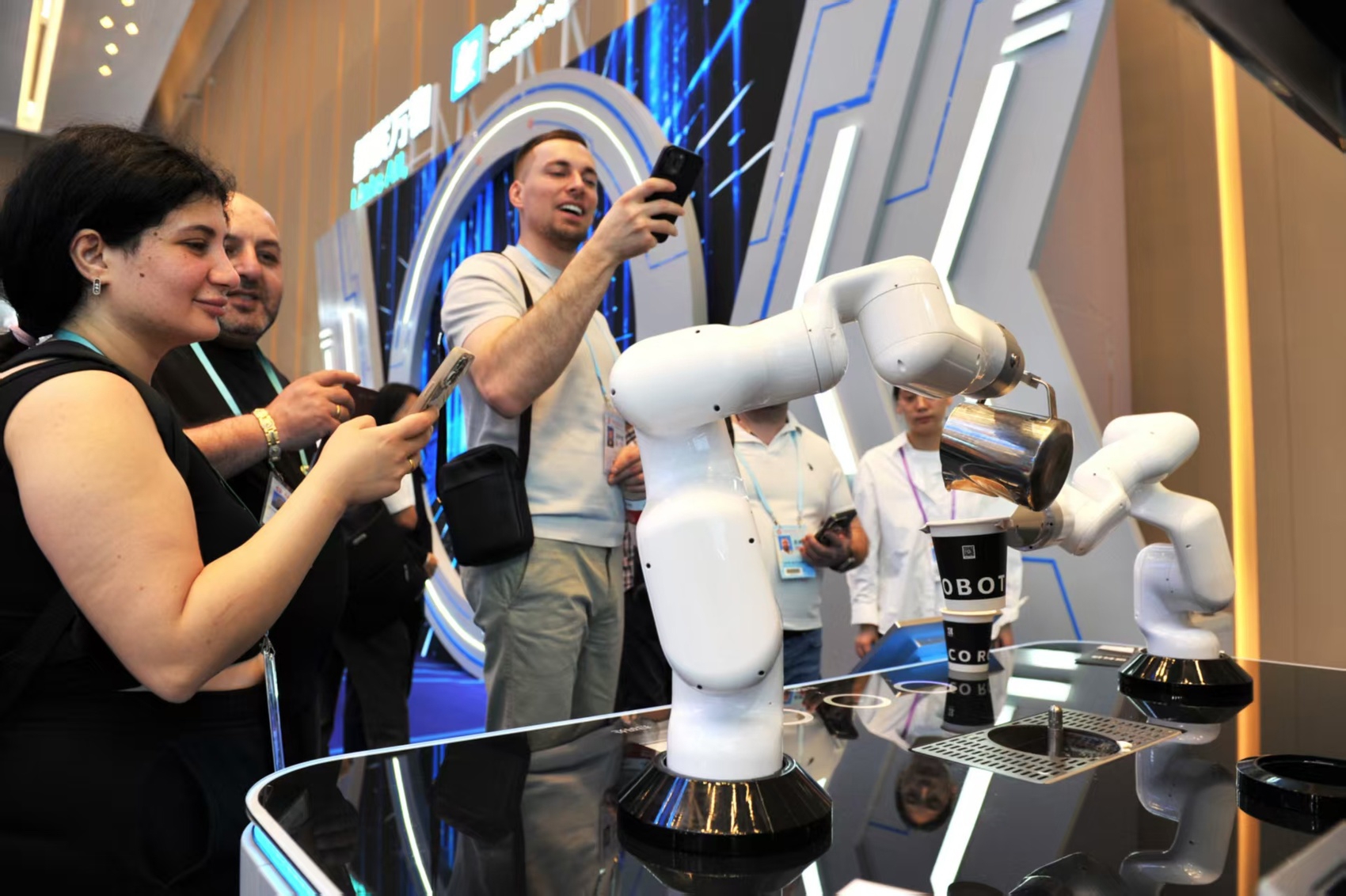 由四川新诚机器人科技有限公司展示的全自动咖啡机器人,在广交会上引起不少国外客商兴趣。受访者供图
