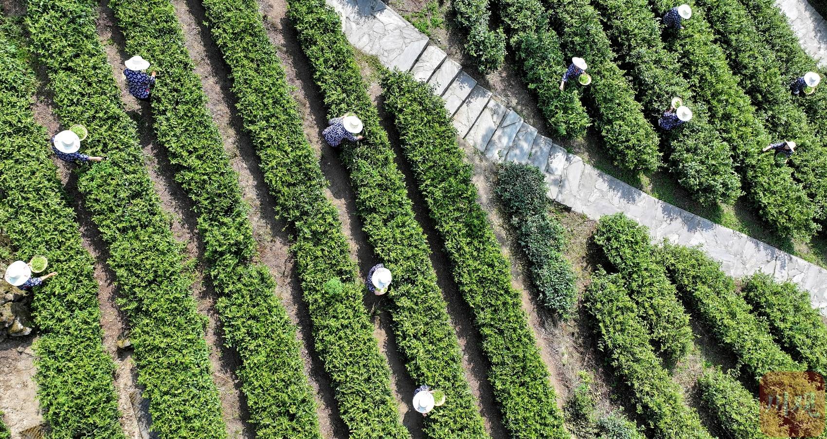 在四川省阿坝州汶川县水磨镇“等风来”茶园,当地茶农正在采茶。