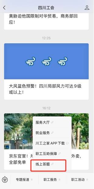 方式一:搜索四川工会微信公众号,进入点击右下方“职工服务”,找到“线上答题”并点击参与;