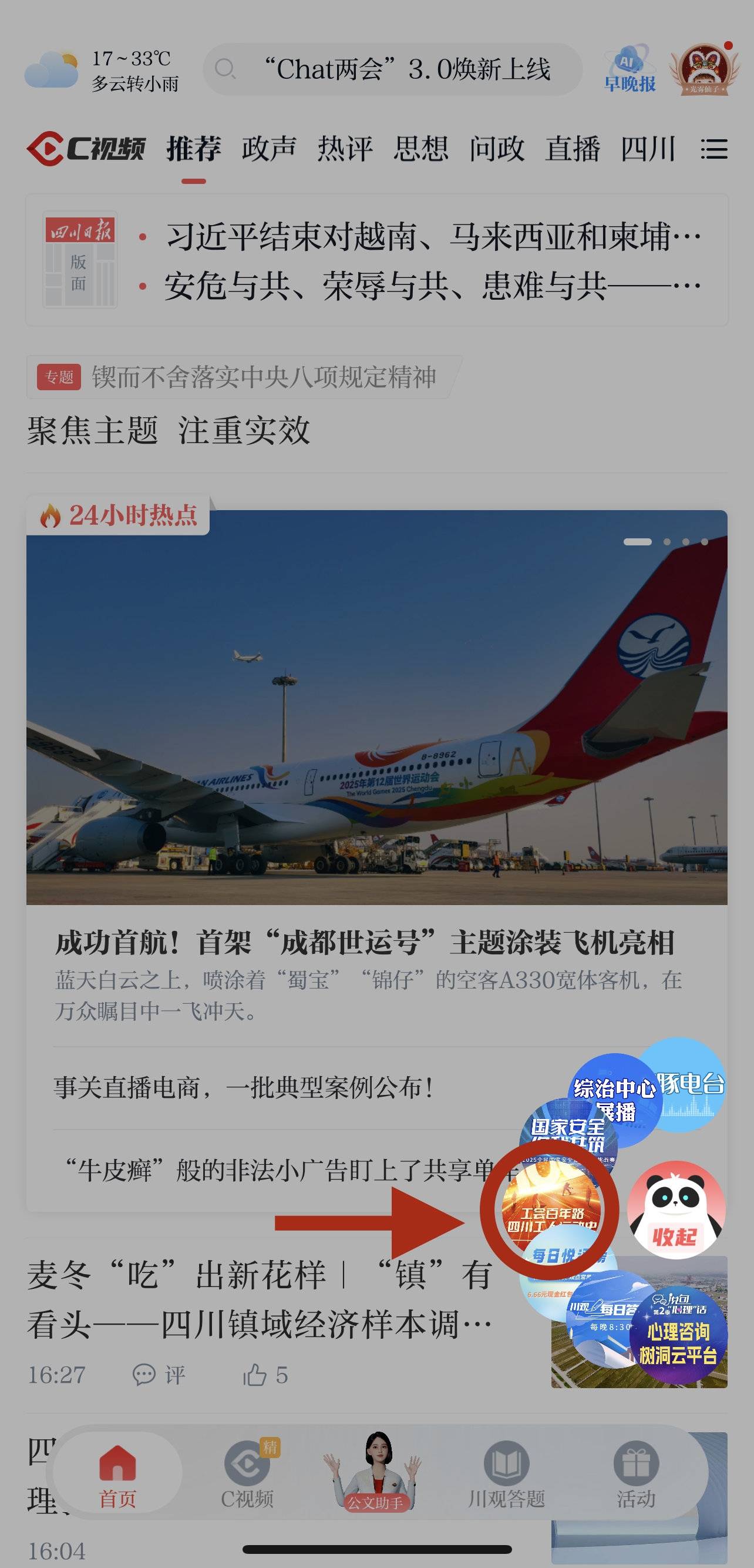 2、进入川观新闻首页,点击右下方悬浮球,找到“工会百年路 四川工人运动史”活动图片点击参与;