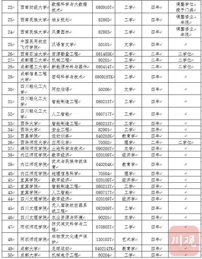 4月22日,教育部正式公布2024年度普通高等学校本科专业备案和审批结果。记者从教育厅获悉,四川高校共新增普通本科专业点48个,新增第二学士学位专业点20个,调整修业年限专业6个,调整学位授予门类专业1个,主动撤销专业点34个。本次备案、审批和调整的专业,将列入相关高校2025年高考招生。