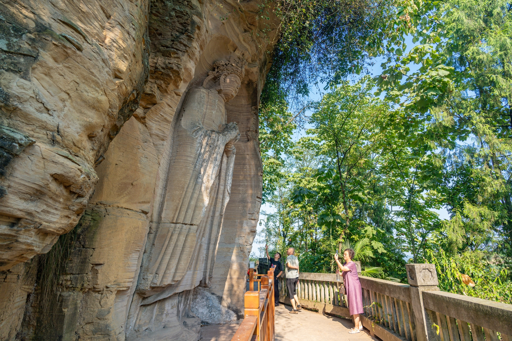 安岳石刻游玩路线受到游客喜爱。图为游客在安岳县茗山寺游览。资阳观察 吴昊江 摄
