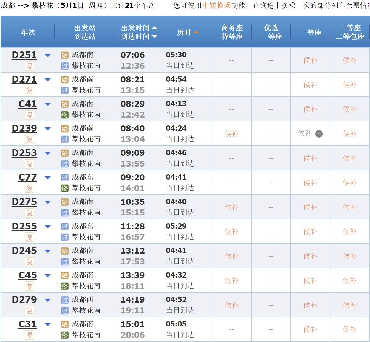 首先是省内高铁出行需求火爆。记者分别查询了5月1日成都前往绵阳、德阳、南充、达州、内江、宜宾、泸州、攀枝花等地的高铁票,已近乎全线处于候补状态,4月30日出行的也仅有部分线路有零星车票在售。