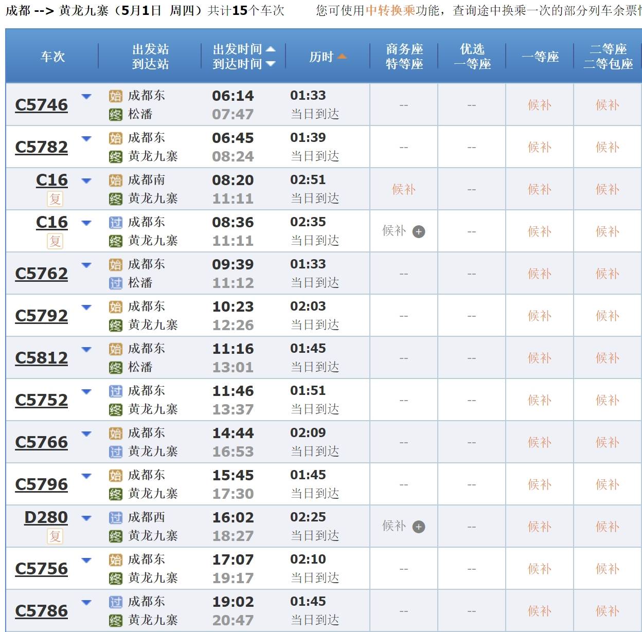 记者4月25日中午查询,5月1日成都至黄龙九寨高铁票全部售罄。