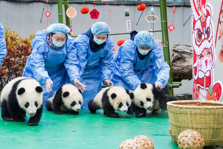 2025年1月23日,在成都大熊猫繁育研究基地,2024年新生大熊猫幼崽亮相新春主题活动。新华社发