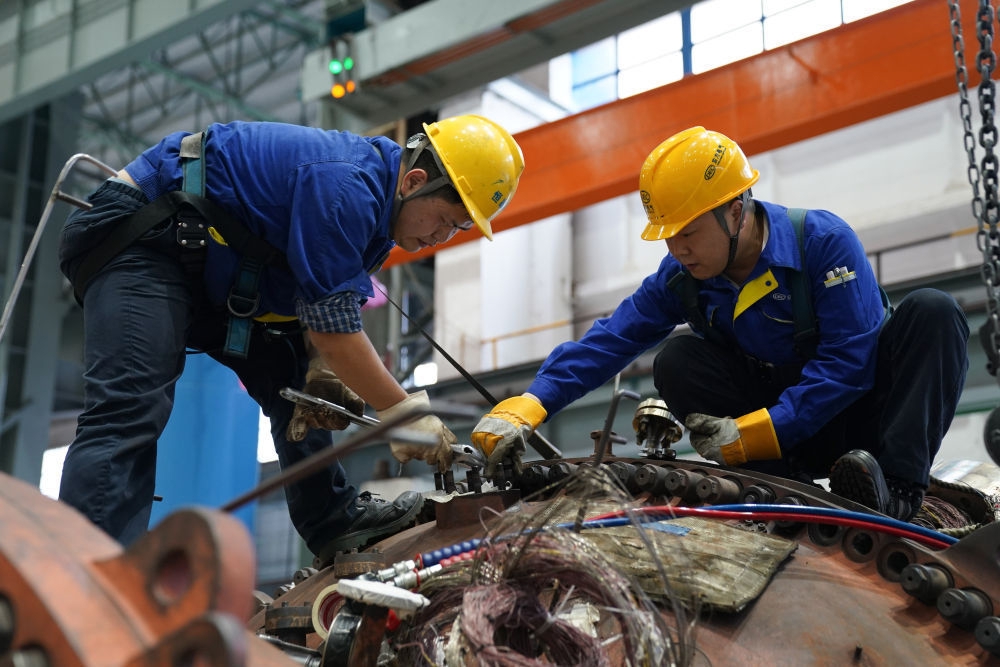 在位于四川省德阳市的东方汽轮机有限公司生产车间内,工作人员对我国首台自主研制的F级50兆瓦重型燃气轮机原型机(代号G50)进行开缸前的检查准备(2024年10月21日摄)。新华社记者 胥冰洁 摄