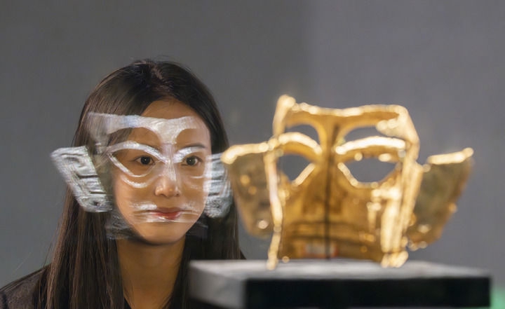 参观者在三星堆博物馆新馆展厅内观看展出的黄金面具(2024年12月18日摄)。新华社记者 才扬 摄