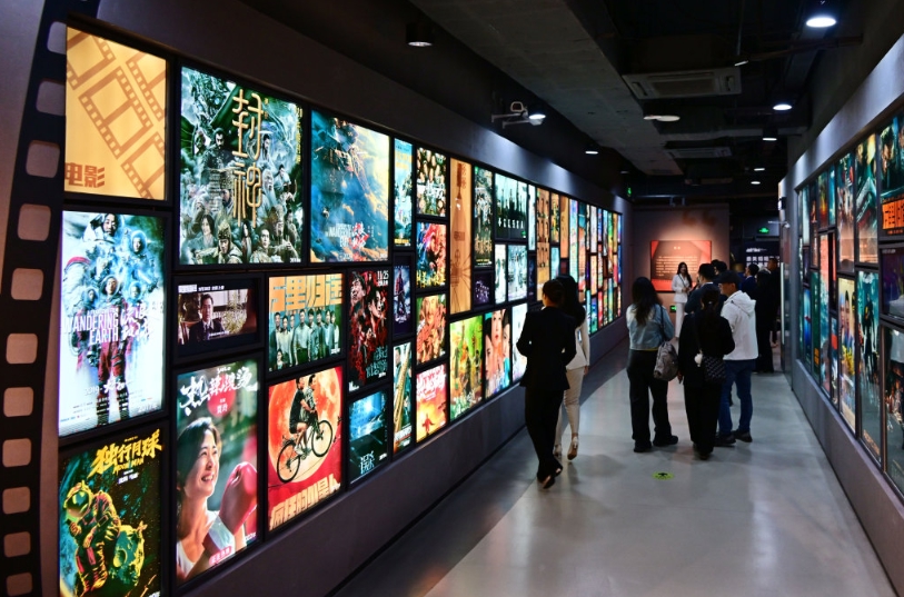 4月28日,观众从青岛电影博物馆电影海报长廊经过。新华社记者 李紫恒 摄