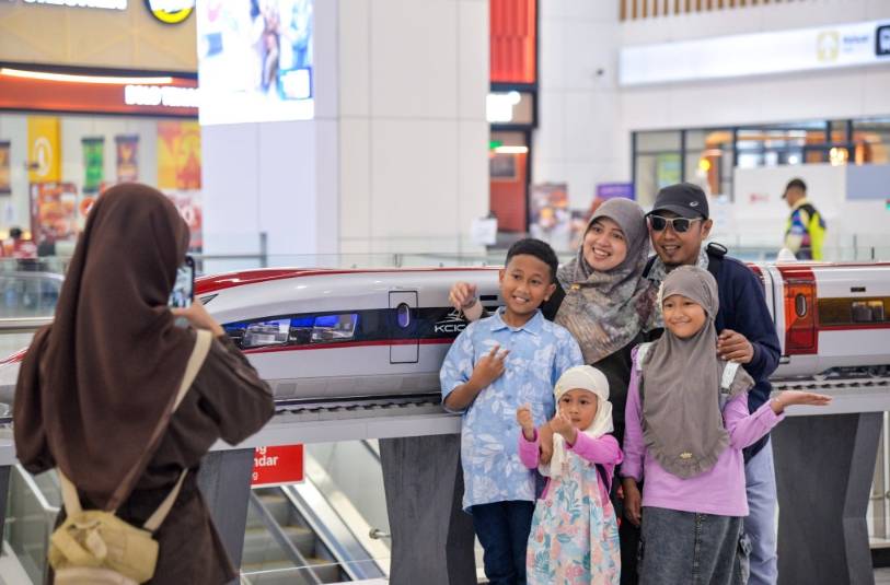 4月28日,在印度尼西亚雅加达,乘客在雅万高铁哈利姆站候车大厅与雅万高铁高速动车组模型合影。新华社记者 徐钦 摄
