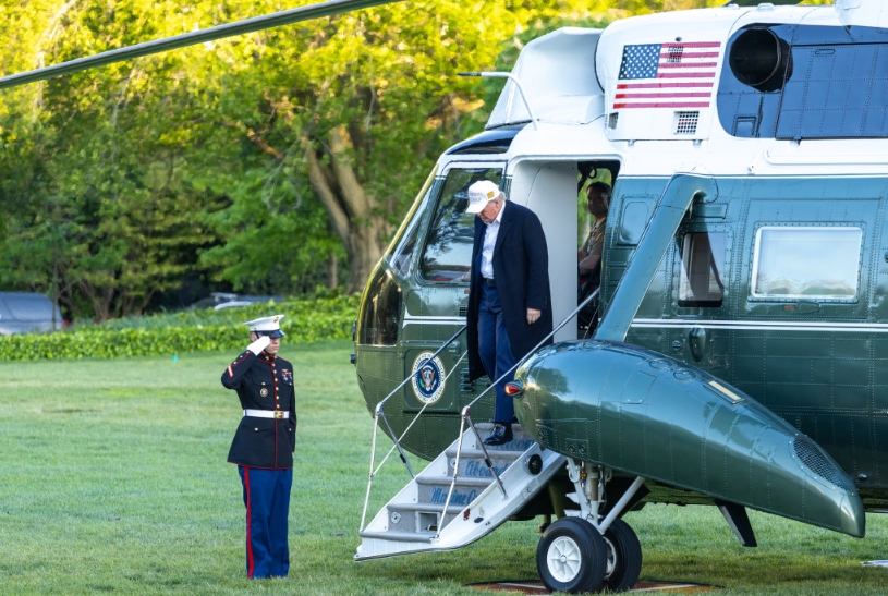 4月27日,在美国首都华盛顿,美国总统特朗普走下直升机。新华社记者 胡友松 摄
