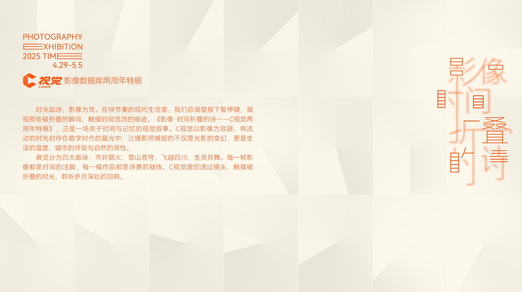 展览分为市井烟火、雪山苍穹、飞越四川、生灵共舞四大版块。每一帧影像都是时间的印记,每一幅作品都是诗意的凝结。观众可透过“C视觉”摄影师的镜头,感受时光的岁月流转,聆听岁月的回响。