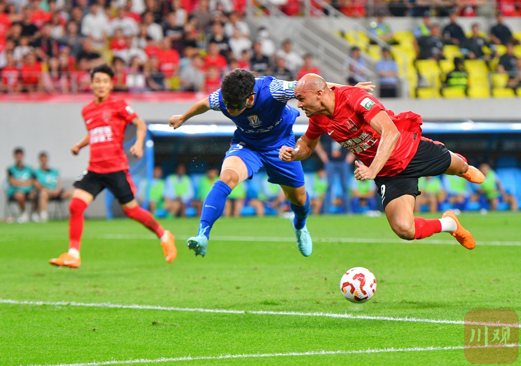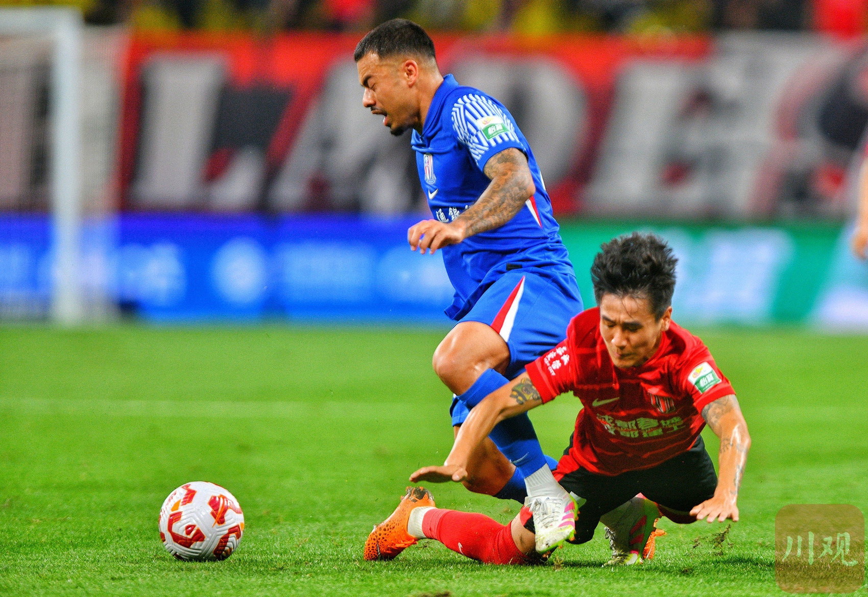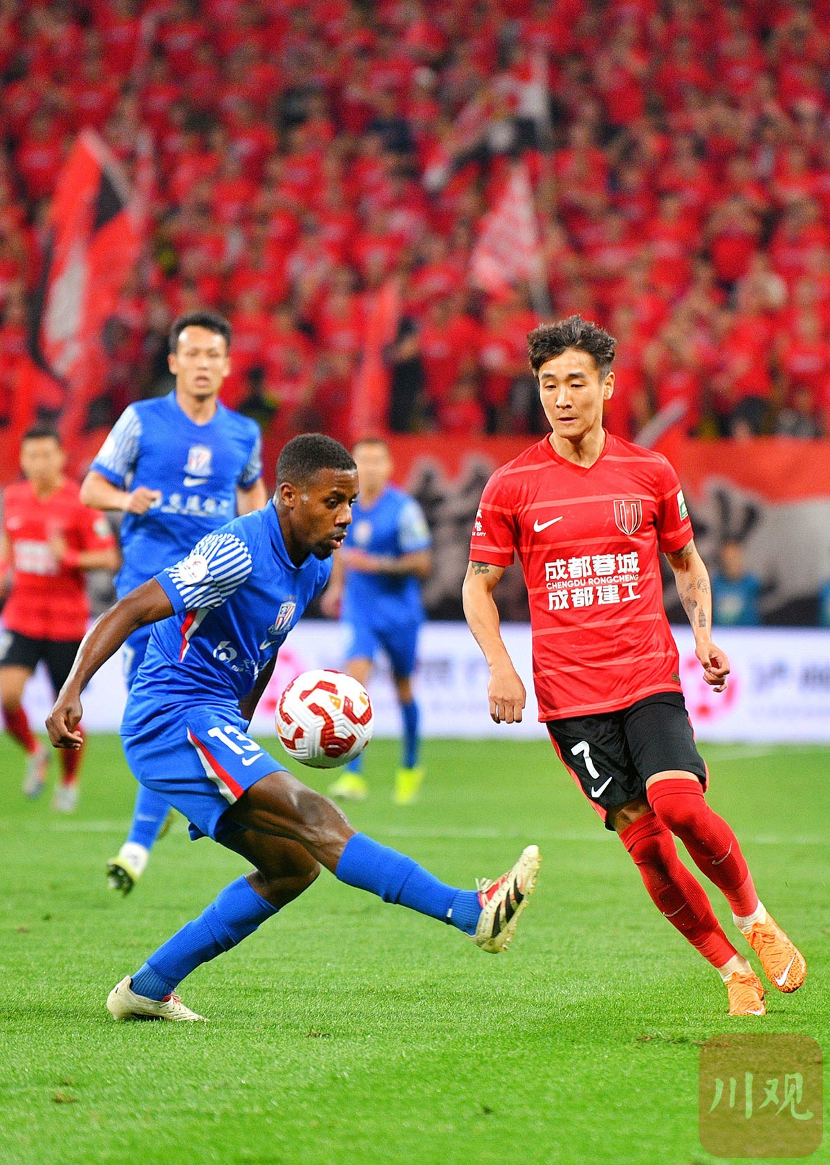 成都蓉城队员韦世豪(红衣)在拼抢。