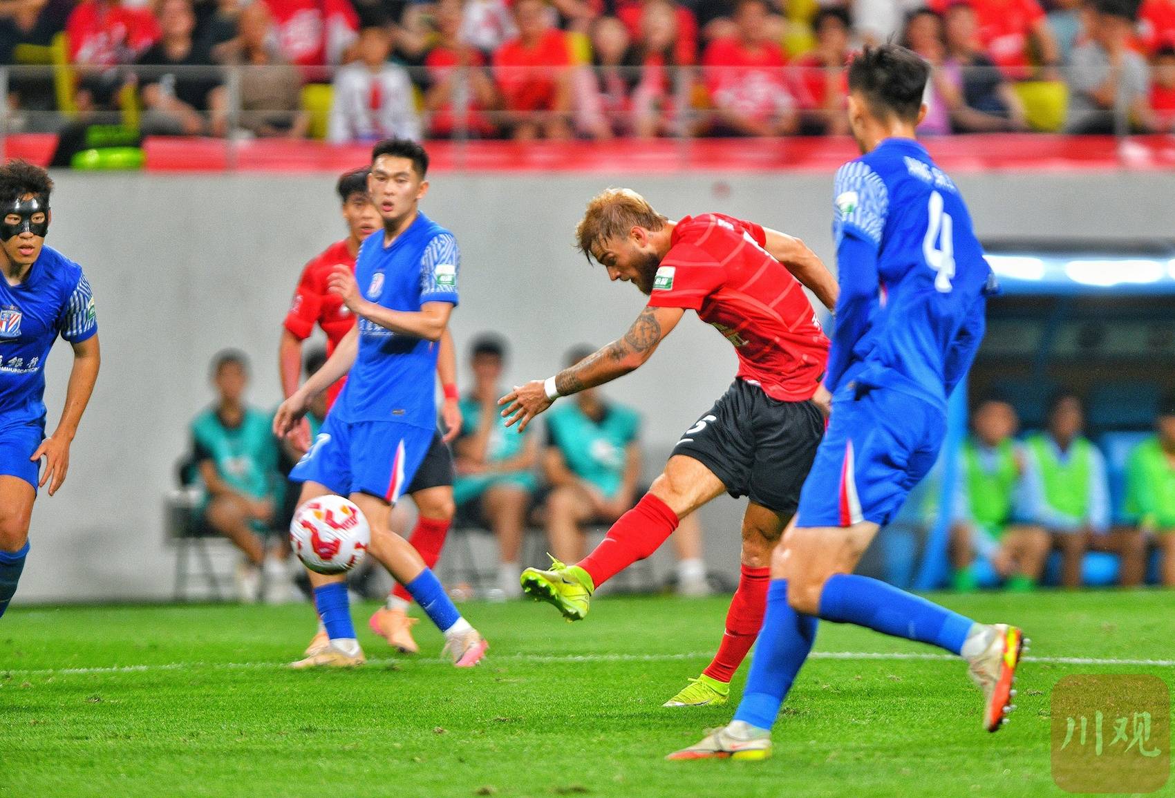 比赛现场争夺激烈,成都蓉城队员韦世豪(红衣)带球突破。