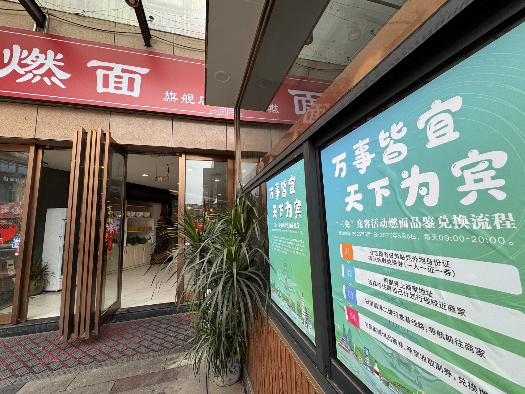 发放“燃面券”,是这个“五一”假期宜宾“宠客”的“三免”政策之一。宜宾市商务局商贸服务与消费促进科相关负责人告诉记者,今年“五一”小长假,宜宾延续了从去年“五一”开始实行的“免费吃面”“免费喝酒”“免费充电”等政策。其中,在全市遴选了40家燃面店,准备了10万张“燃面券”,外地游客凭身份证可以在全市11个景区和交通站点领取。