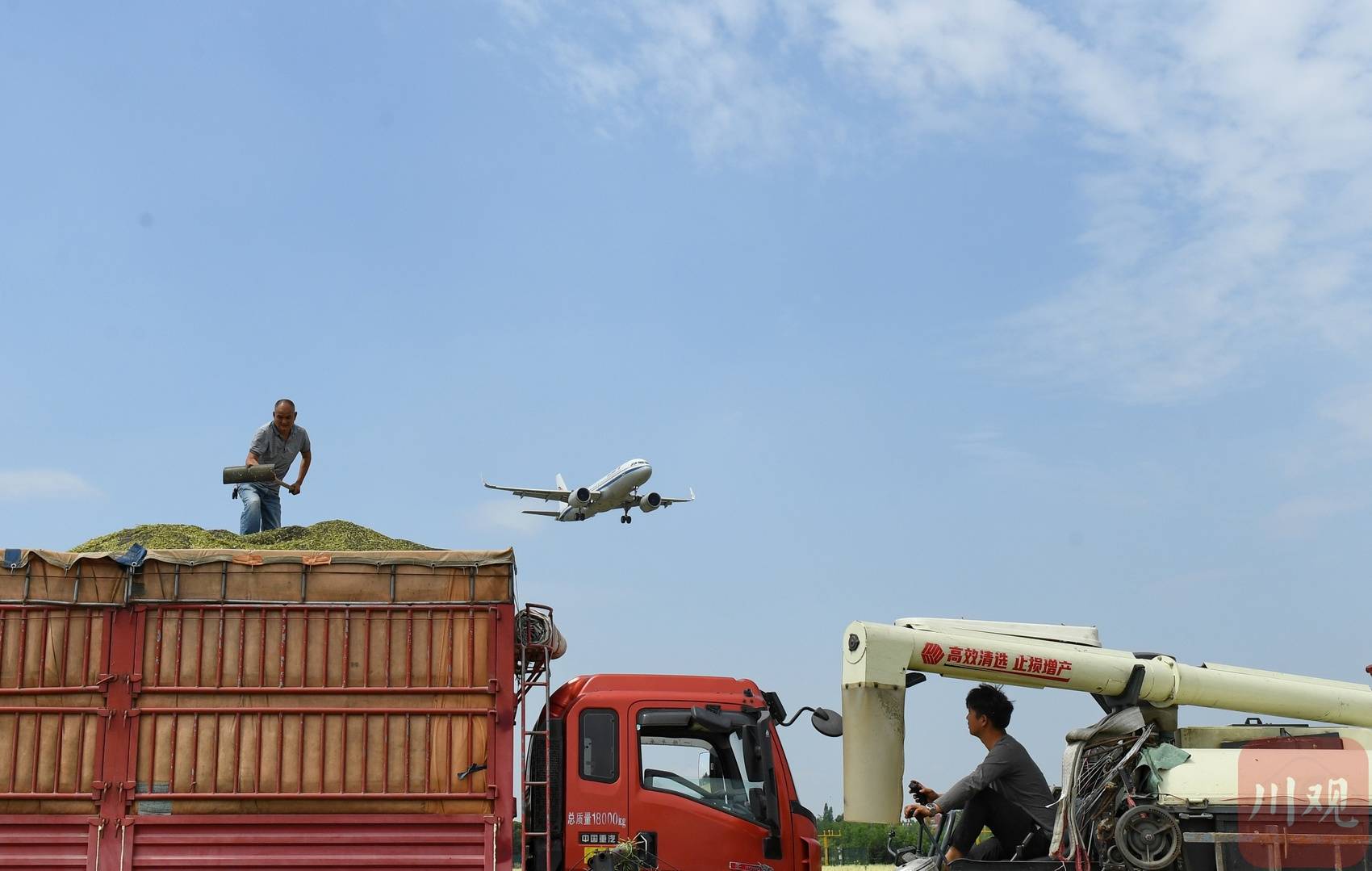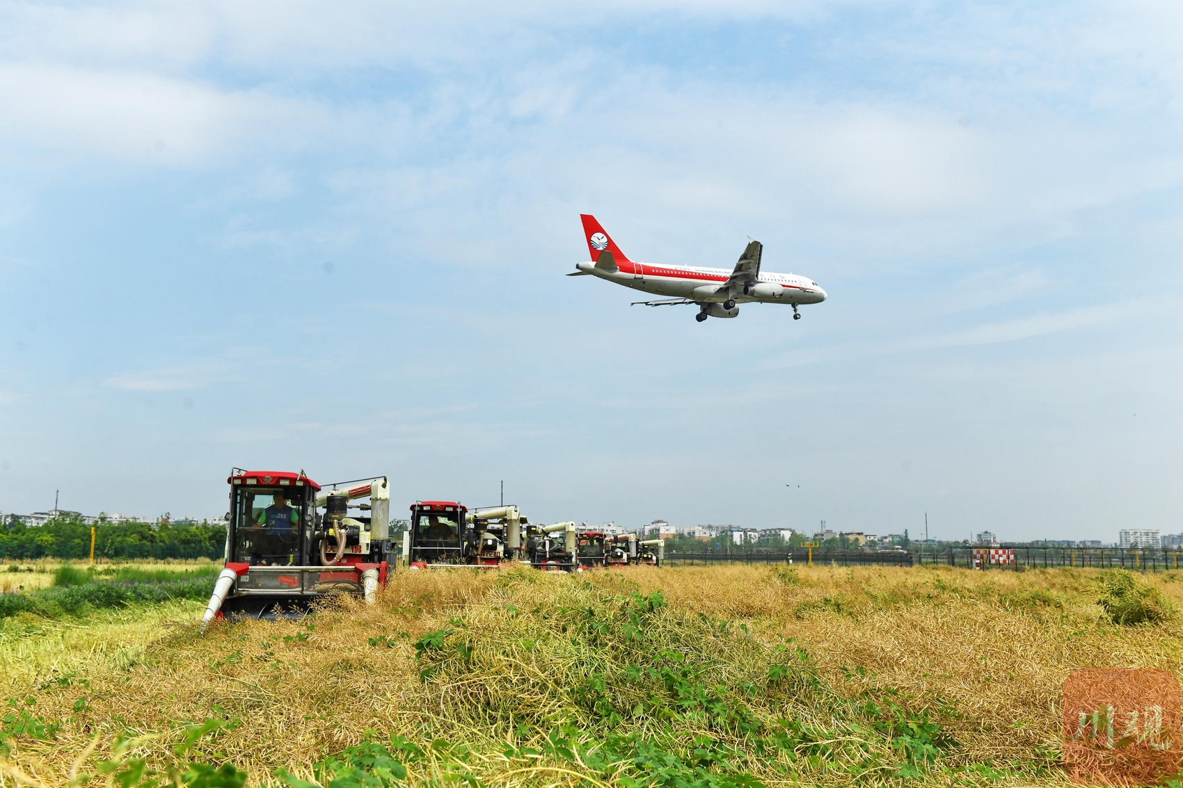 2025 年5月7日,位于成都市双流区东升街道环港绿洲,收割机正在作业收割油菜籽,正值油菜籽丰收期,为确保油菜籽颗粒归仓,当地抢抓晴好天气,组织 6 台收割机加快油菜籽收割进程。一架架大飞机不时从头顶呼啸而过,与抢收油菜籽的收割机同框,成为别样的风景线。