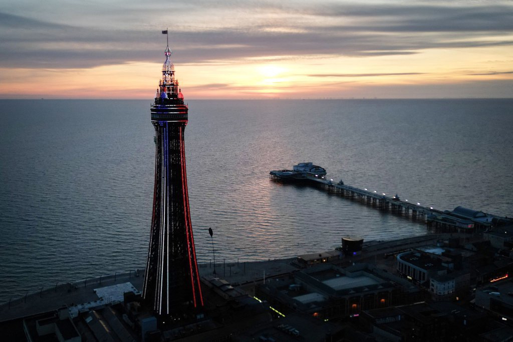 5月6日,英国布莱克浦塔亮起英国国旗色彩灯光。