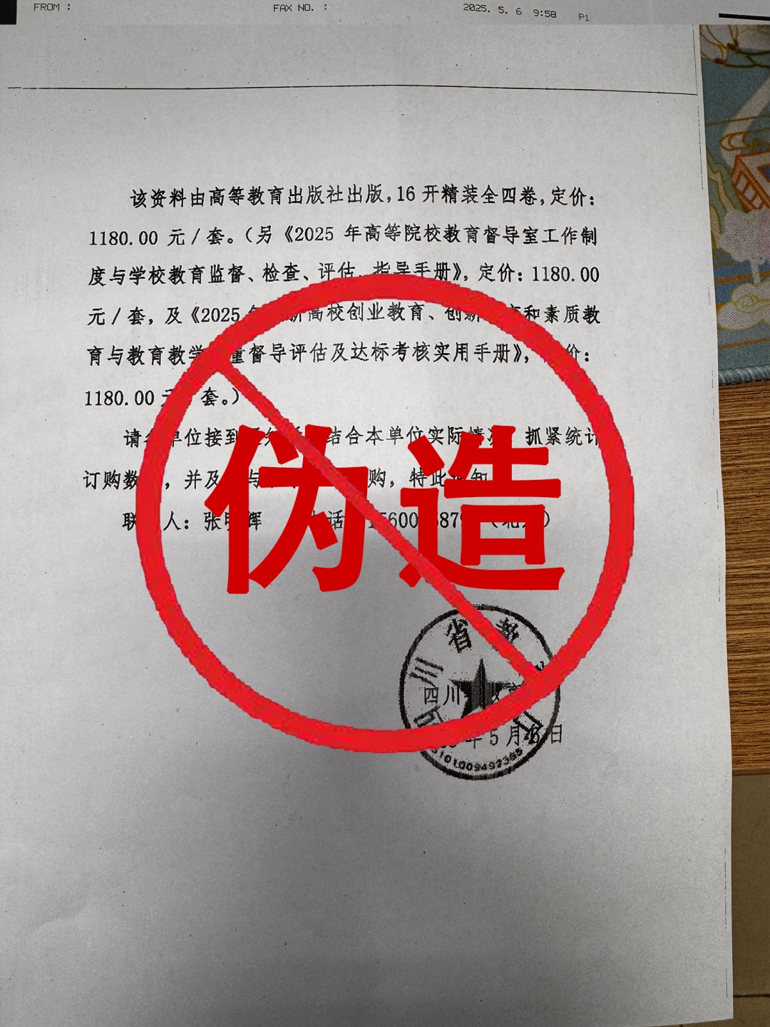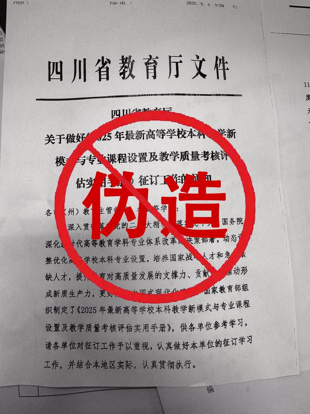 近期,我省个别高校通过传真接到《四川省教育厅关于做好<2025年最新高等学校本科教学新模式与专业课程设置及教学质量考核评估实用手册>征订工作的通知》,要求各市(州)教育主管部门和高校征订相关手册。经核查,我厅从未下发此通知,系相关机构或个人非法冒用我厅印章伪造公文。我厅已向公安机关报案,并将依法追究其法律责任。在此提醒:我厅正式公文一律通过机要渠道或OA办公系统发送,并有严格规范的收发文程序。请各地各校提高警惕,谨防上当受骗。
