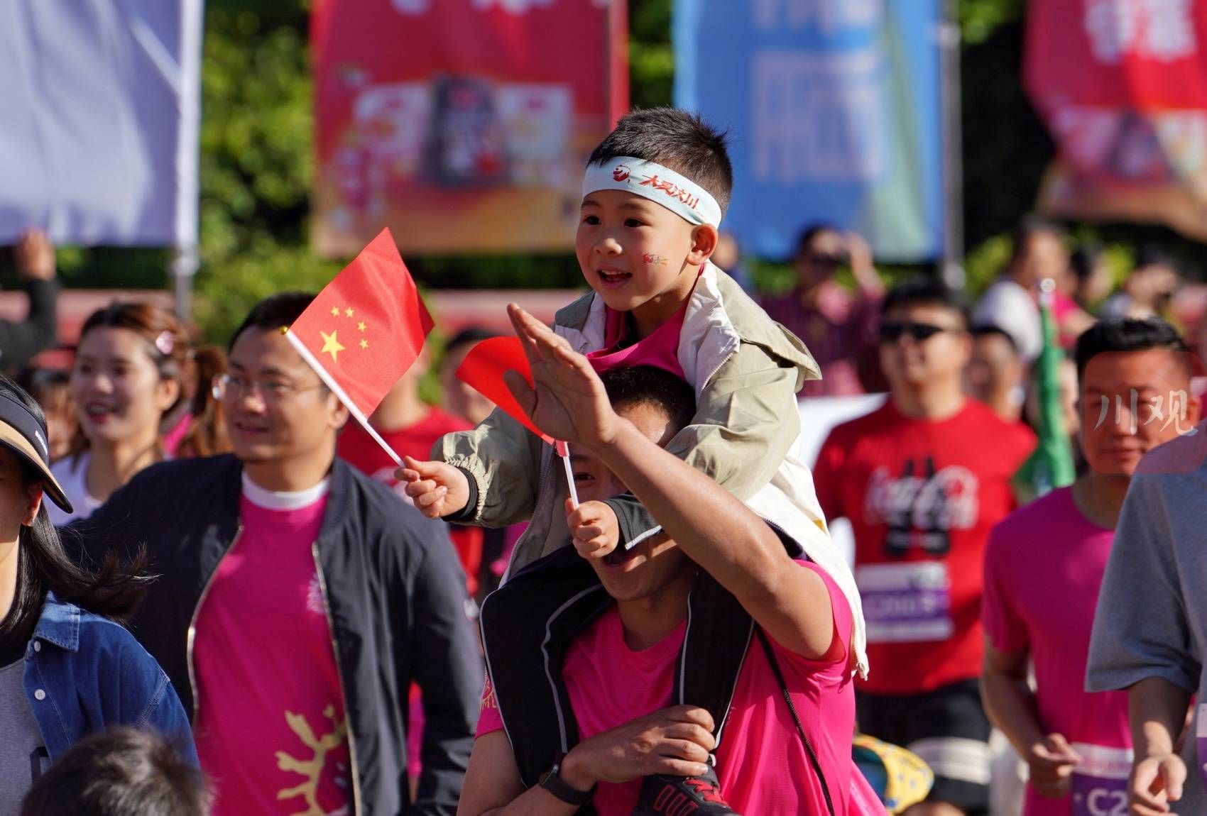 2025年5月11日,在四川省阿坝州汶川县映秀镇,一名小朋友手举小红旗为选手加油助威。