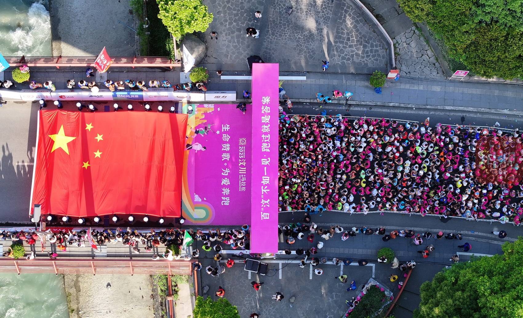 2025年5月11日,在四川省阿坝州汶川县映秀镇,“生命礼赞·为爱奔跑”2025汶川半程马拉松赛开赛前举行五星红旗传递仪式。