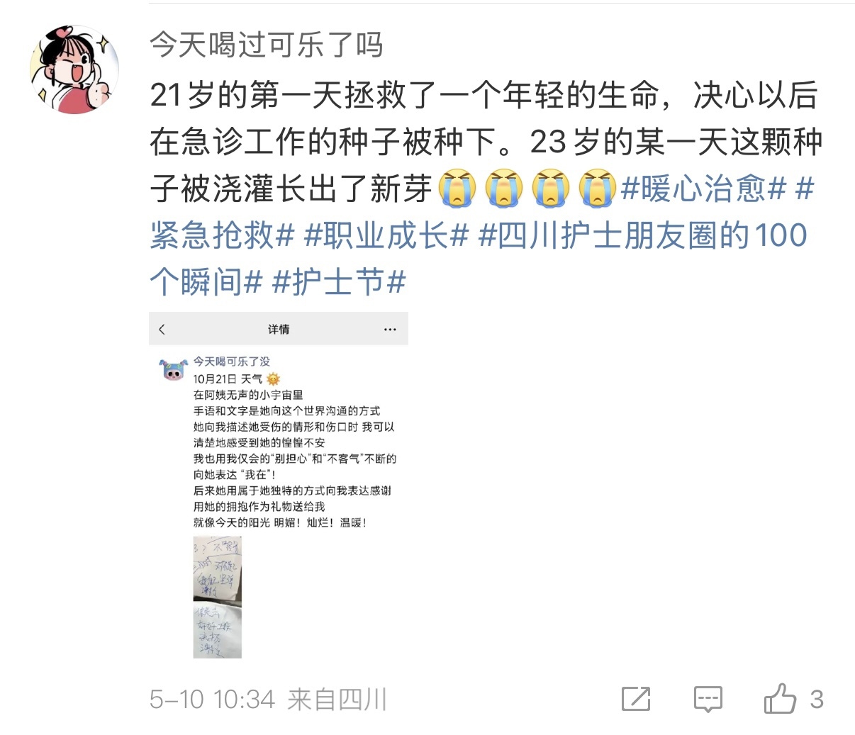 21岁生日当天在急诊室挽救生命的经历,让网友@今天喝过可乐了吗 坚定了职业选择。