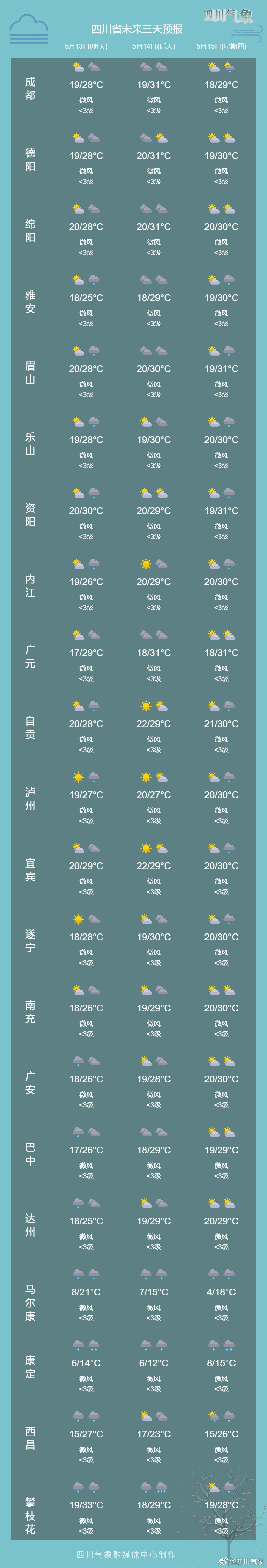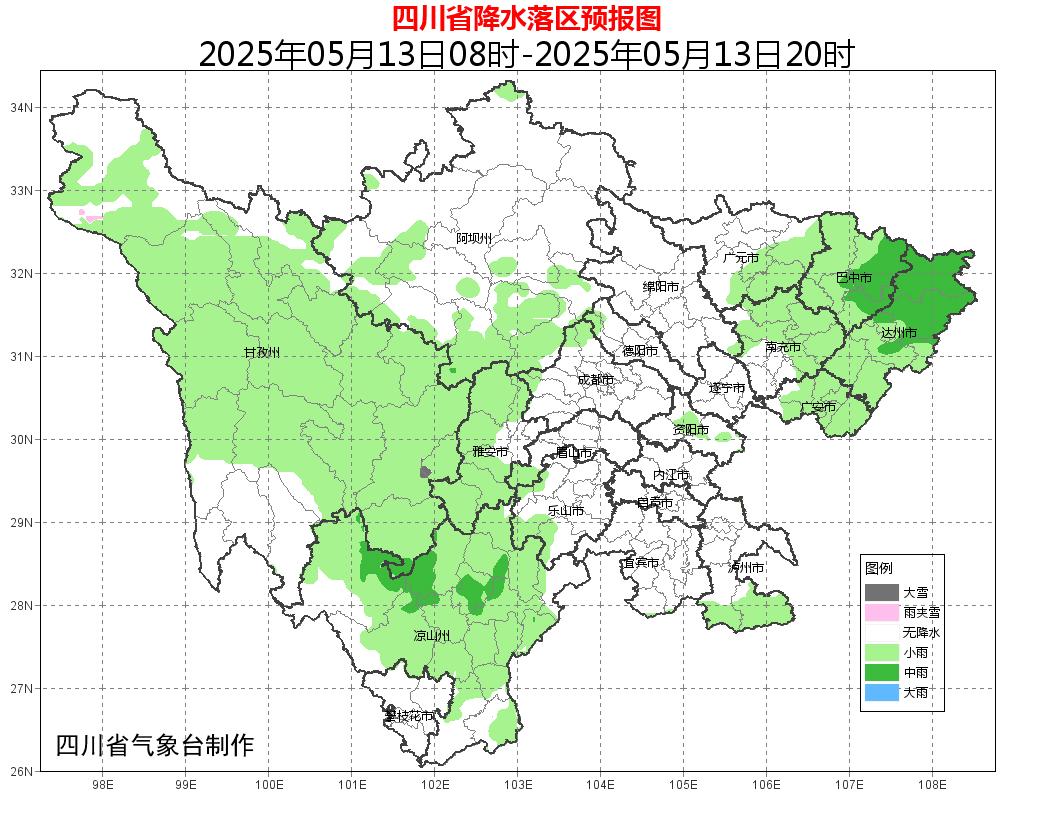 明天(5月13日)白天,巴中、南充、达州、广安4市和广元东部阵雨或雷雨转多云,局部中雨,盆地其余地方多云间阴,有分散雷雨或阵雨;甘孜和凉山2州大部地方多云间阴有阵雨(雪)或雷雨,局部中雨,阿坝州和攀枝花市以多云间晴天气为主。