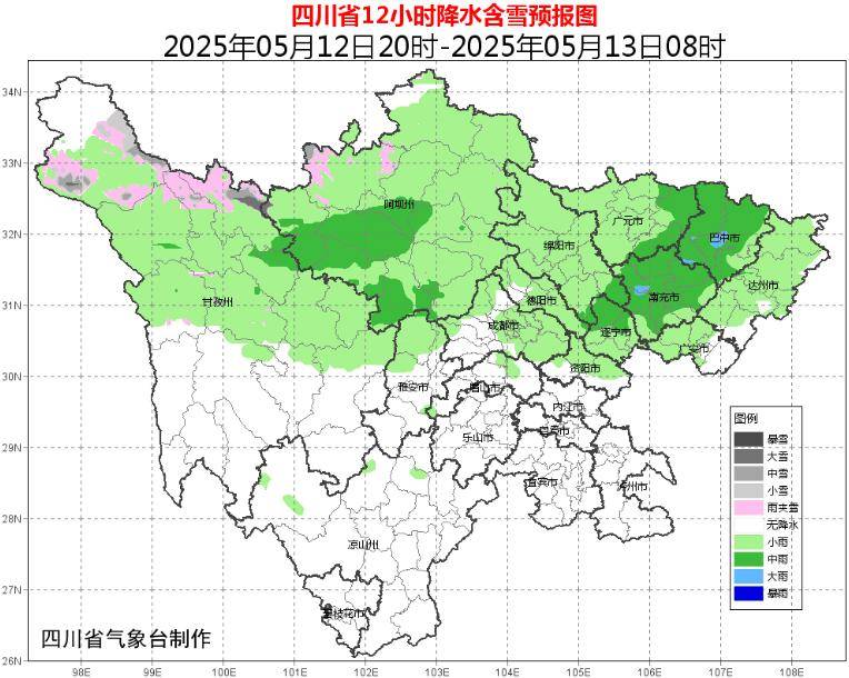 预计今天(5月12日)14时至20时,阿坝州大部、甘孜州北部东部和凉山州西北部多云间阴有分散阵雨(雪)或雷雨。